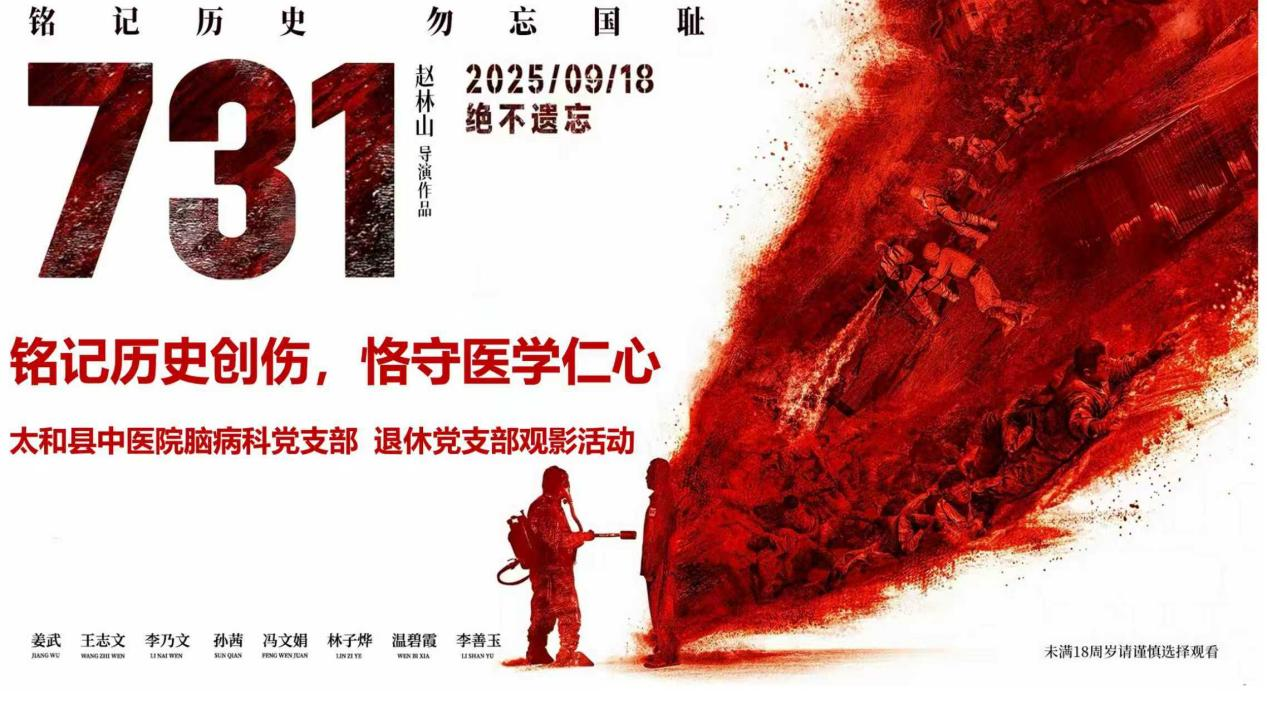 为铭记历史、缅怀先烈,传承爱国主义精神,太和县中医院脑病科党支部于9月19日组织支部党员观看历史题材电影《731》。