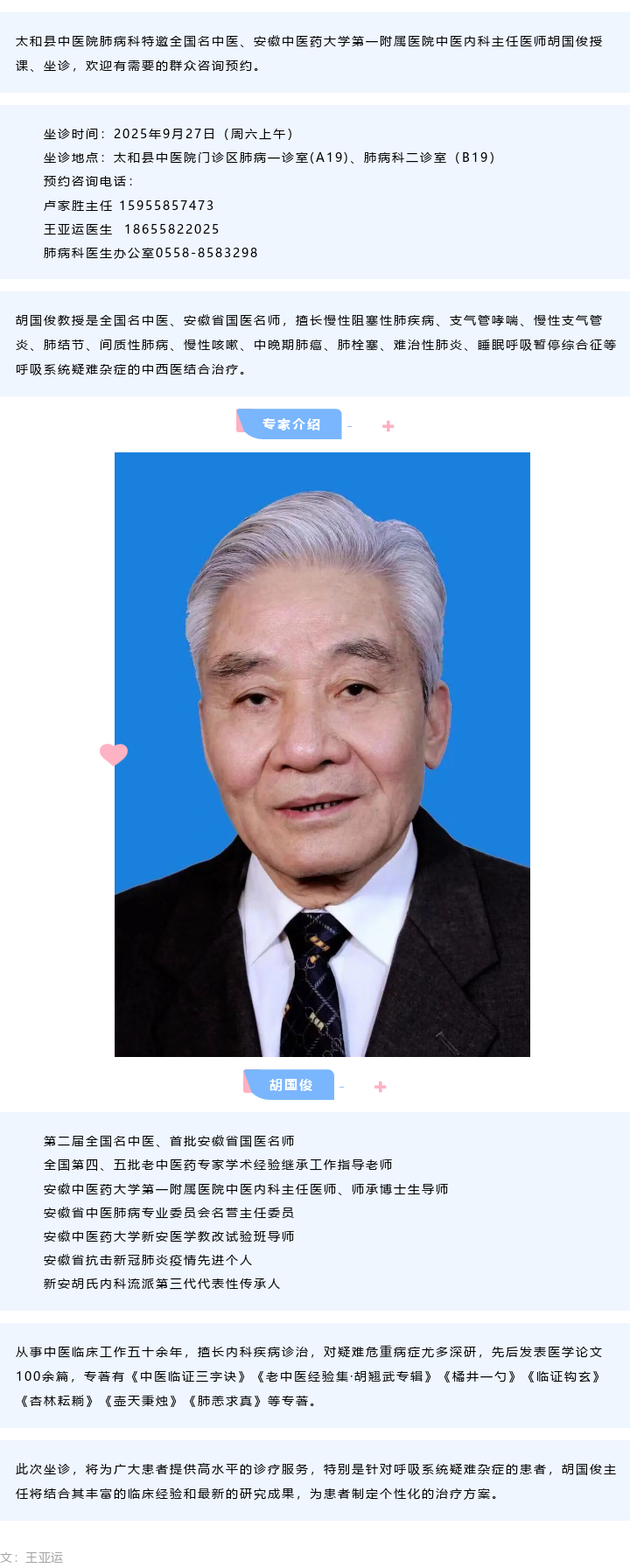 【专家医讯】2025年9月27日(周六)全国名中医胡国俊教授亲临太和县中医院坐诊