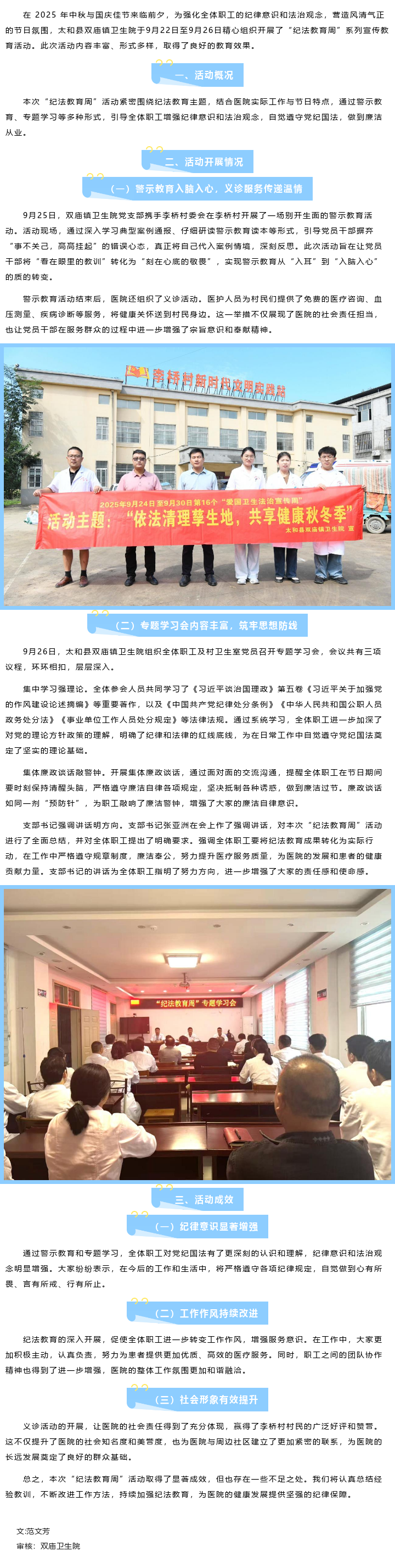 太和县双庙镇卫生院开展“纪法教育周”系列活动