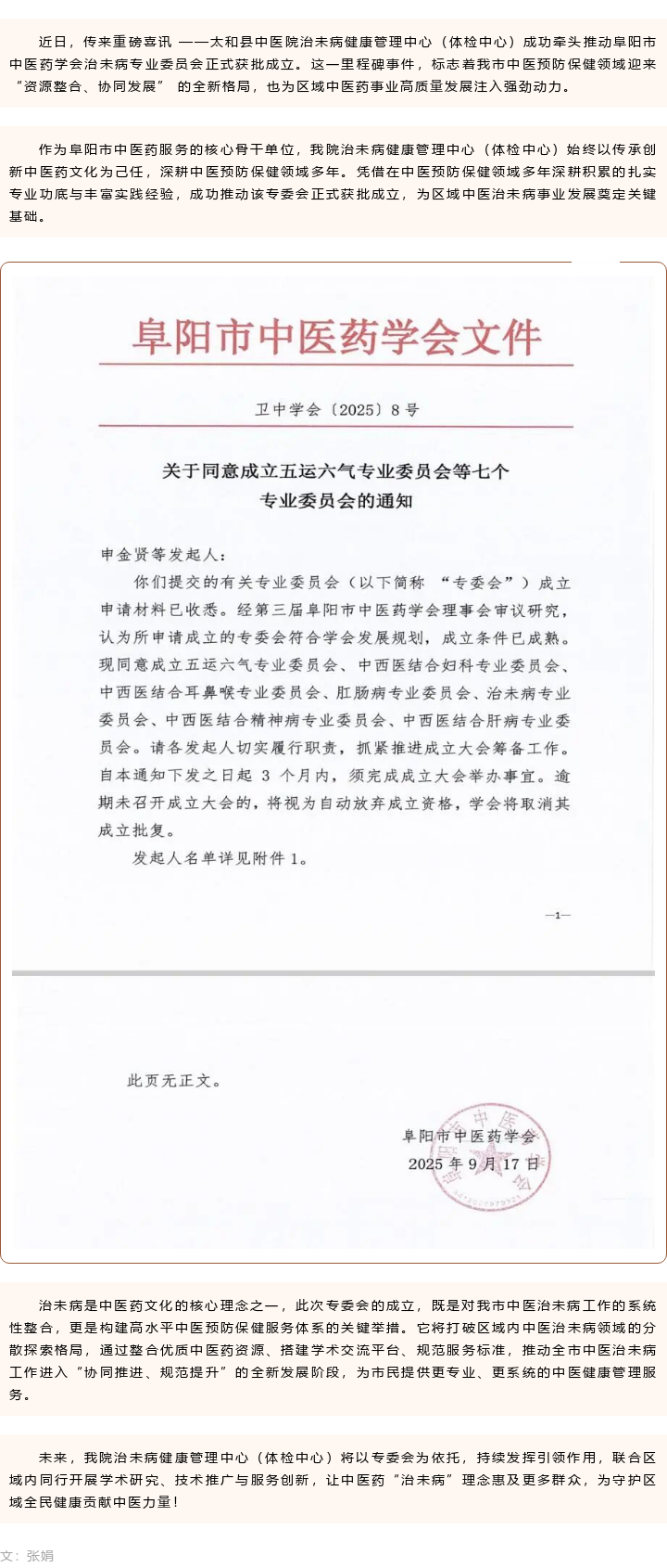喜报!太和县中医院治未病健康管理中心(体检中心)获批成立阜阳市中医药学会治未病专业委员会,区域中医预防保健事业迈入新阶段!