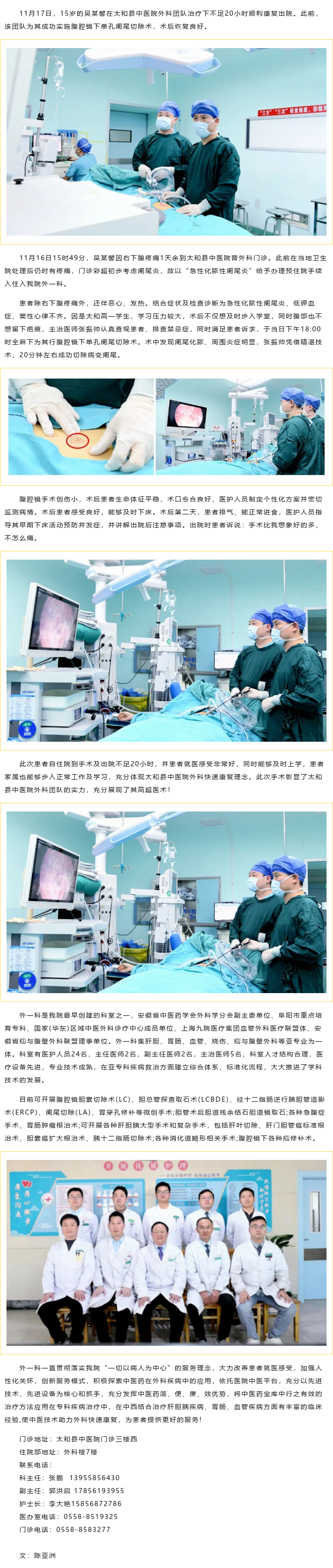 15岁少女单孔腹腔镜阑尾切除术,术后一日康复出院