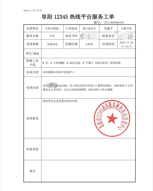 一份份感谢,是最温暖的勋章近期,阜阳12345热线平台接连收到多份来自市民的表扬工单,字里行间满是对太和县中医院骨四骨七科医护人员的认可与感谢。每一份工单,都是一份沉甸甸的信任;每一句称赞,都是一份温暖的勋章,见证着医患之间的双向奔赴。