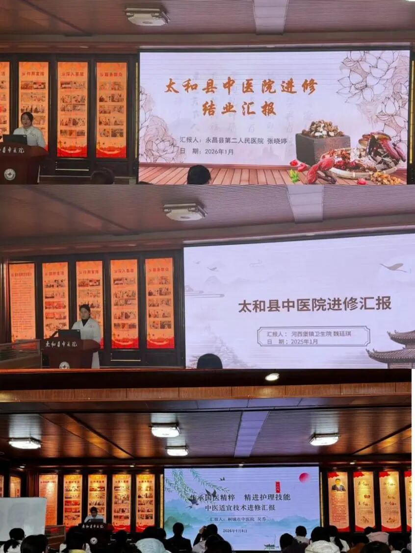近日,太和县中医院护理部成功举办一场干货满满的护理进修人员结业汇报会!护理部主任孙海燕、副主任张晨,院内中医护理骨干及相关临床科室护士长悉数到场,与来自桐城市中医院的吴乔、永昌县第二人民医院的张晓婷和魏廷琪三位进修老师齐聚一堂,共同复盘数月进修的丰硕成果。这场汇报既是进修人员个人成长成效的集中展示,更是跨区域、跨医院中医护理经验互鉴的优质平台,为本轮进修工作画上了圆满句号。