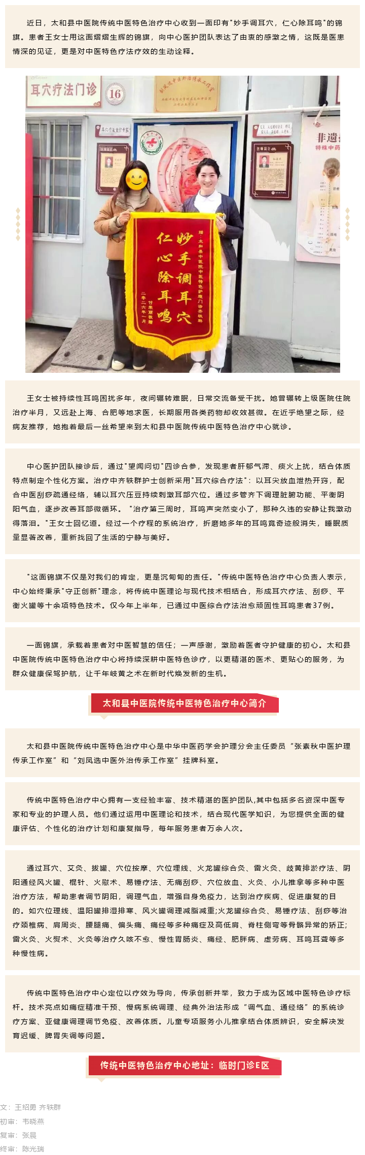 妙手调耳穴 仁心除耳鸣——太和县中医院传统中医特色治疗中心再获患者赞誉