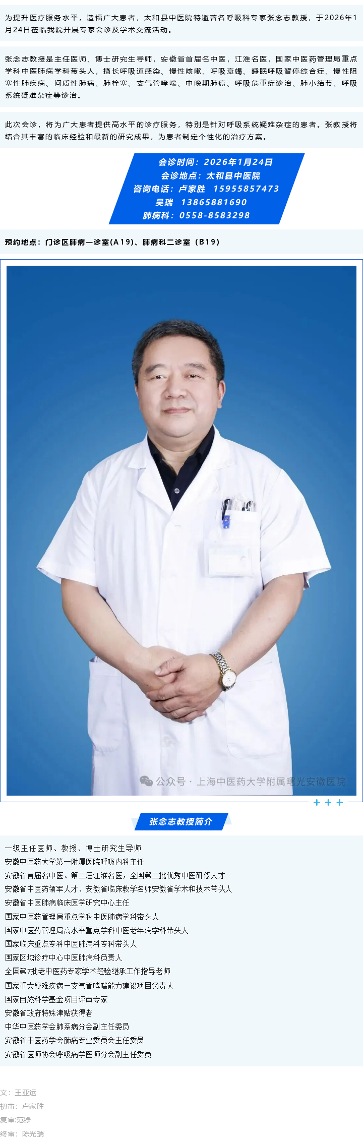专家医讯:2026年1月24日上午著名呼吸科专家张念志教授将莅临太和县中医院开展会诊及学术交流活动